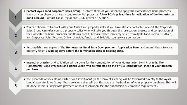 - Contact Ayala Land Corporate Sales group to inform them of your intent to apply the Homestarter Bond proceeds towards a purchase of an Ayala Land residential property. Allow 1-2 days lead time for validation of the Homestarter Bond account. Contact Lanie Ong at 908-3532 or 0917-8727847.